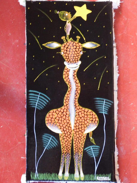 大手化粧品会社に勤めている中、ふと入った雑貨店でタンザニアアート「ティンガティンガ」を目にし、独特な構図と躍動感溢れる色彩表現に魅了され、自らティンガティンガを描くことを決意。
