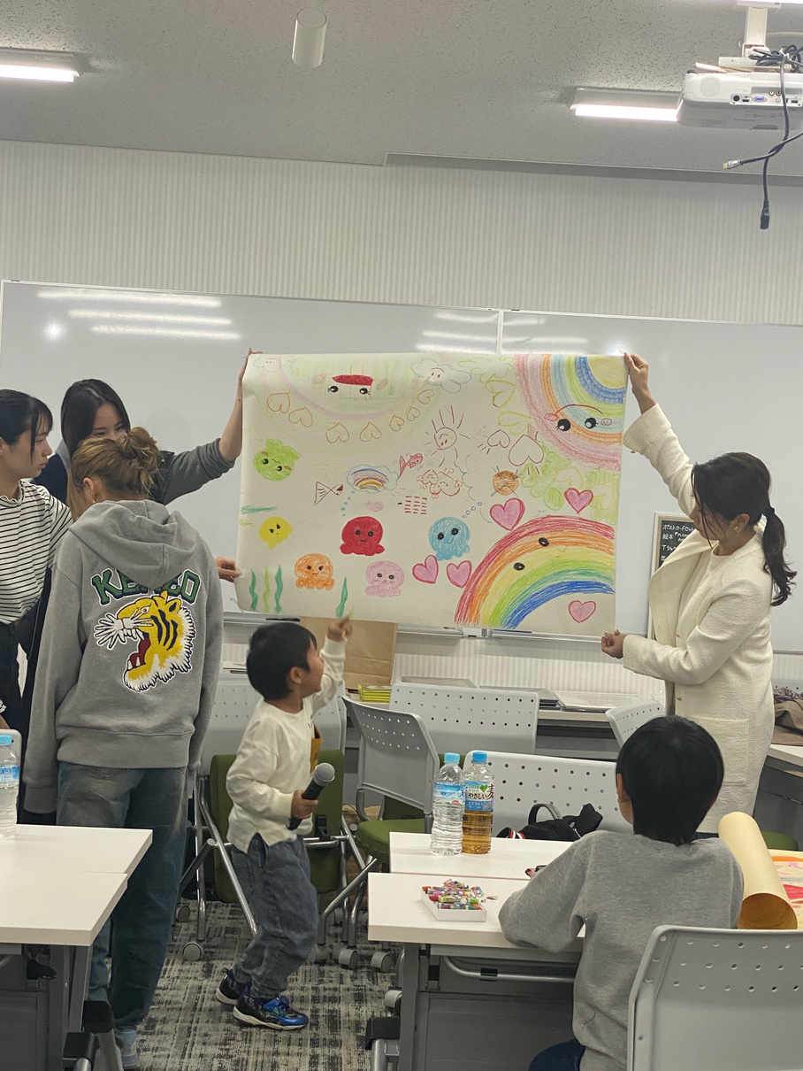 5〜6人でグループになりSHOGENさんから与えられるテーマをもとに物語をつくり、大きな紙にクレヨンでグループのみんなで絵を描いていくワークショップ。